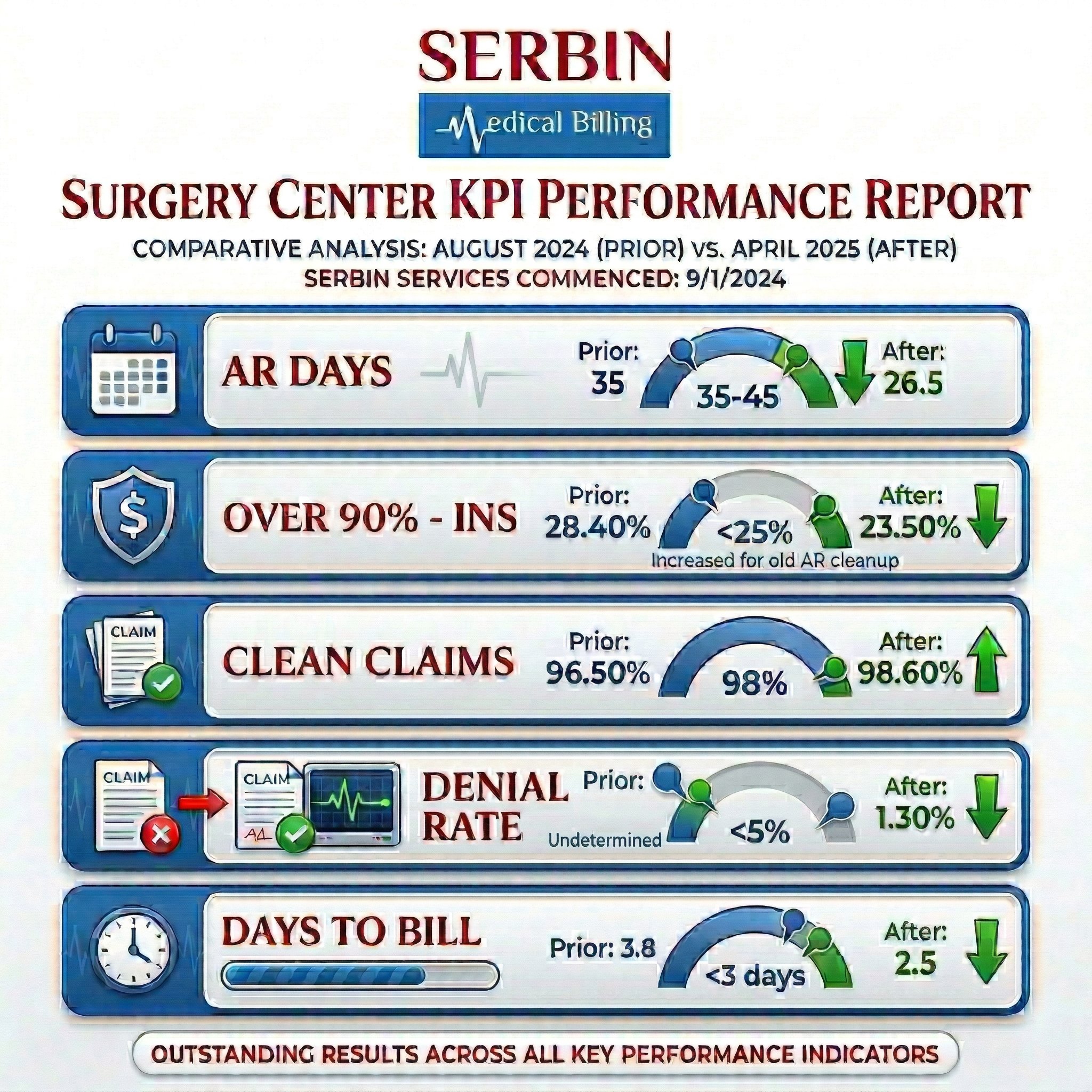 Serbin Medical Billing’s collectors began following up on submitted claims in a timely manner. Working through the current and the legacy AR, following ASC standard follow-up time frames and adhering to payer time frames. Rather than writing off aged claims, Serbin Medical Billing’s team worked through the center’s legacy accounts receivable systematically, identifying underpayments, filing appeals on denied claims, and pursuing outstanding balances that had been sitting untouched. This approach converted previously stalled revenue into actual cash flow.